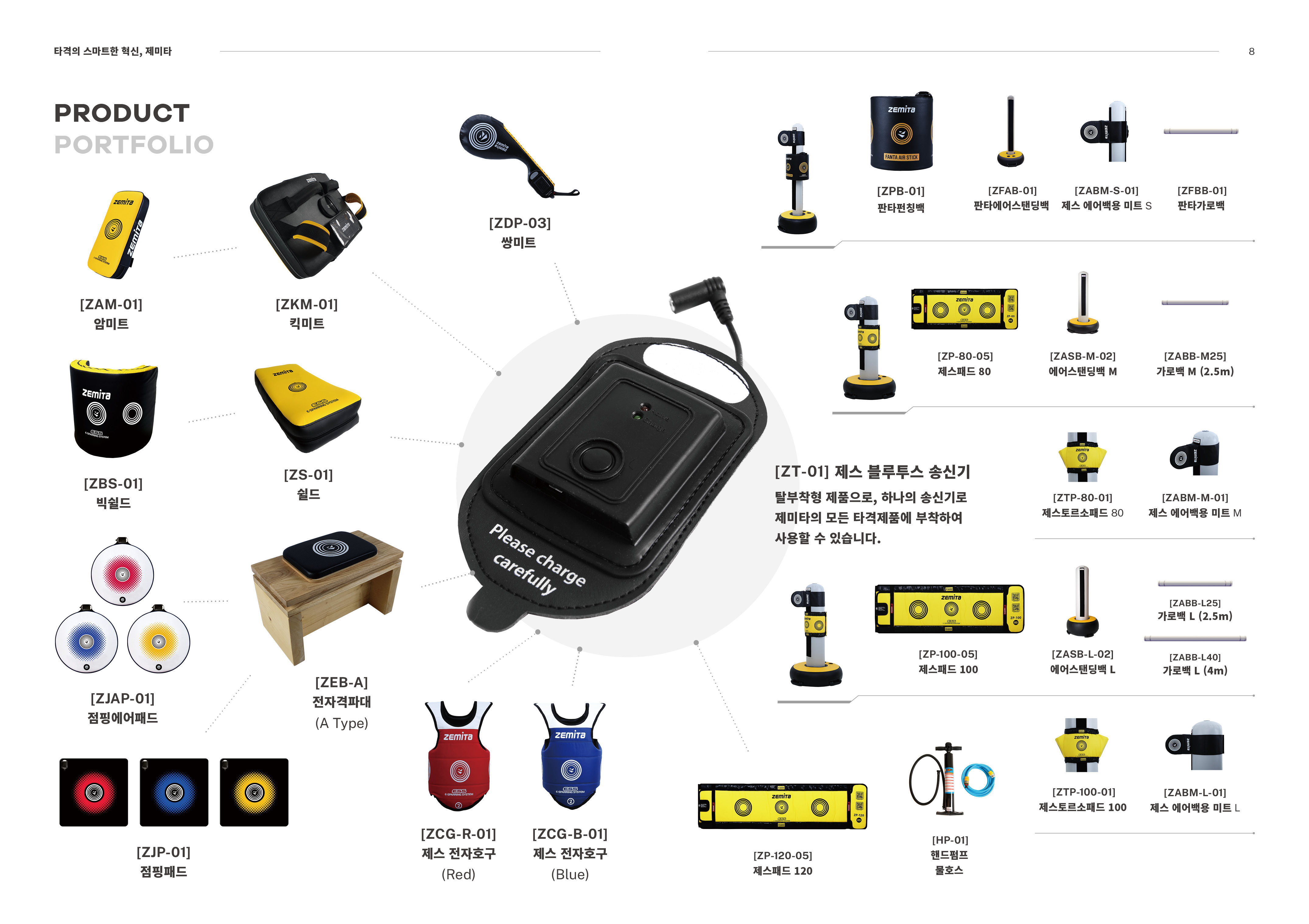 제미타 전자겨루기 시스템은 탈부착할 수 있는 송신기를 기본으로 휴대간편한 휴대형제품, 착용가능한 착용형, 에어백이나 스탠딩백에 부착가능한 부착형으로 구분됩니다.