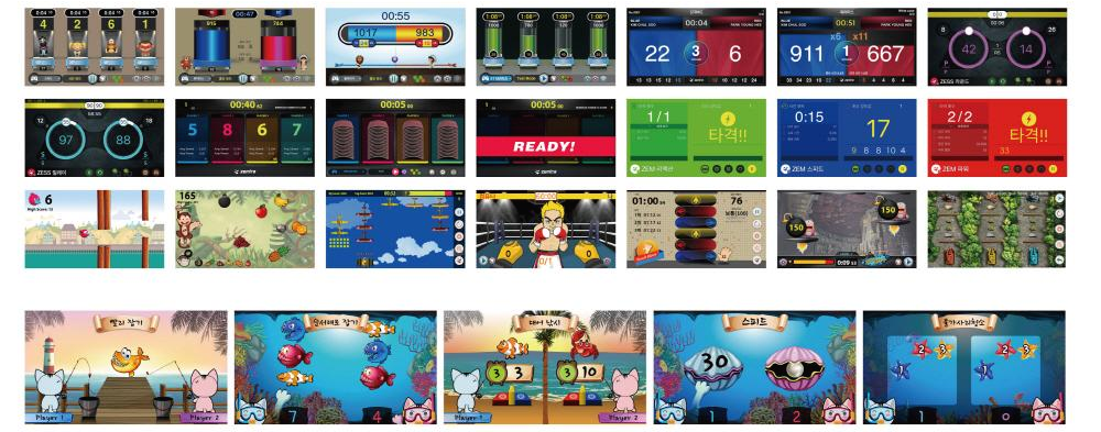 - 제스 G: 캐릭터와 함께 스피드, 줄다리기, 파이터스, 스테미나, 스코어보드 등을 이용하여 최대 4인/4팀 운영 가능