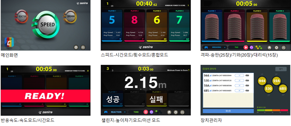 - 격파: 제미타 전자격파대와 연결하여 운영 추천, 송판모드(초급용)/기와(중급용)/대리석(고단자용)