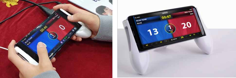 •시합용 전자호구와 달리 센싱양말을 착용하지 않아도 모든 타격에 반응하는 도장 수련용 스마트 보호구.
