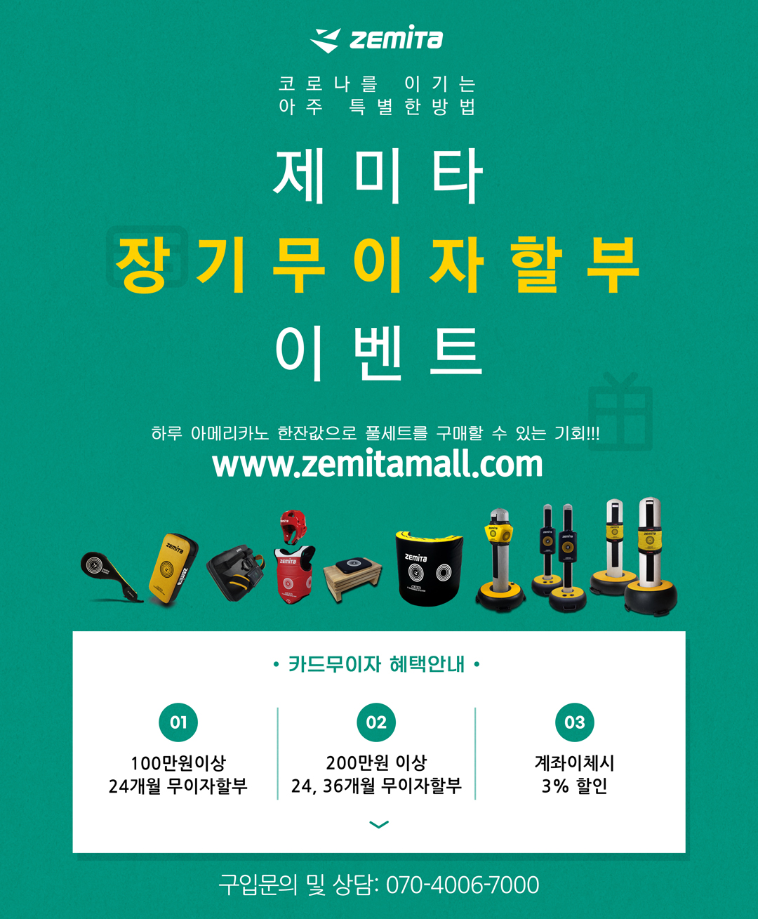 제미타 제품을 구입하고 싶은데 예산부족으로 아쉽게도 구매계획을 미뤘던 분들에게 드리는 무이자 장기할부 이벤트입니다. 하루 커피한잔값이면 4명이 참여가능한 제미타 전자겨루기시스템을 구입할 수 있습니다.