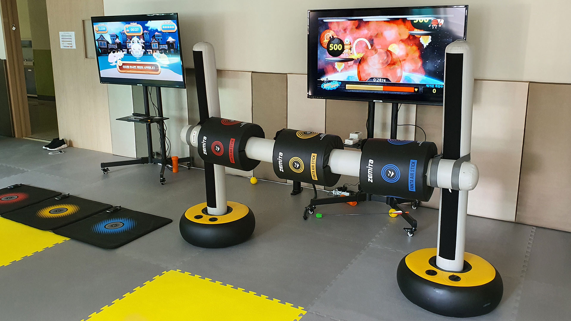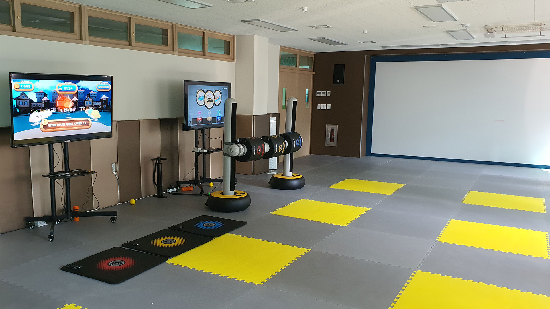 관산초등학교에 설치된 사진은 #타타몽과 #타타타 게임이 기존 스크린스포츠 교실에 설치된 모습입니다. 기존에 스크린 스포츠도 다양한 운동을 할 수 있지만 제미타 처럼 신나게 실제 두드리고 뛰기에는 약간의 부족함이 있지요.