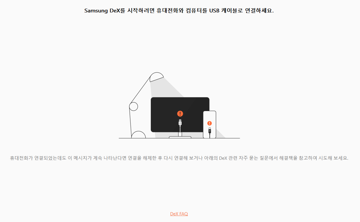 만약 연결이 되지 않거나 검은 화면이 나타나는 경우 덱스 화면 상단 설정에 들어가서 FAQ를 참조하시면 됩니다.